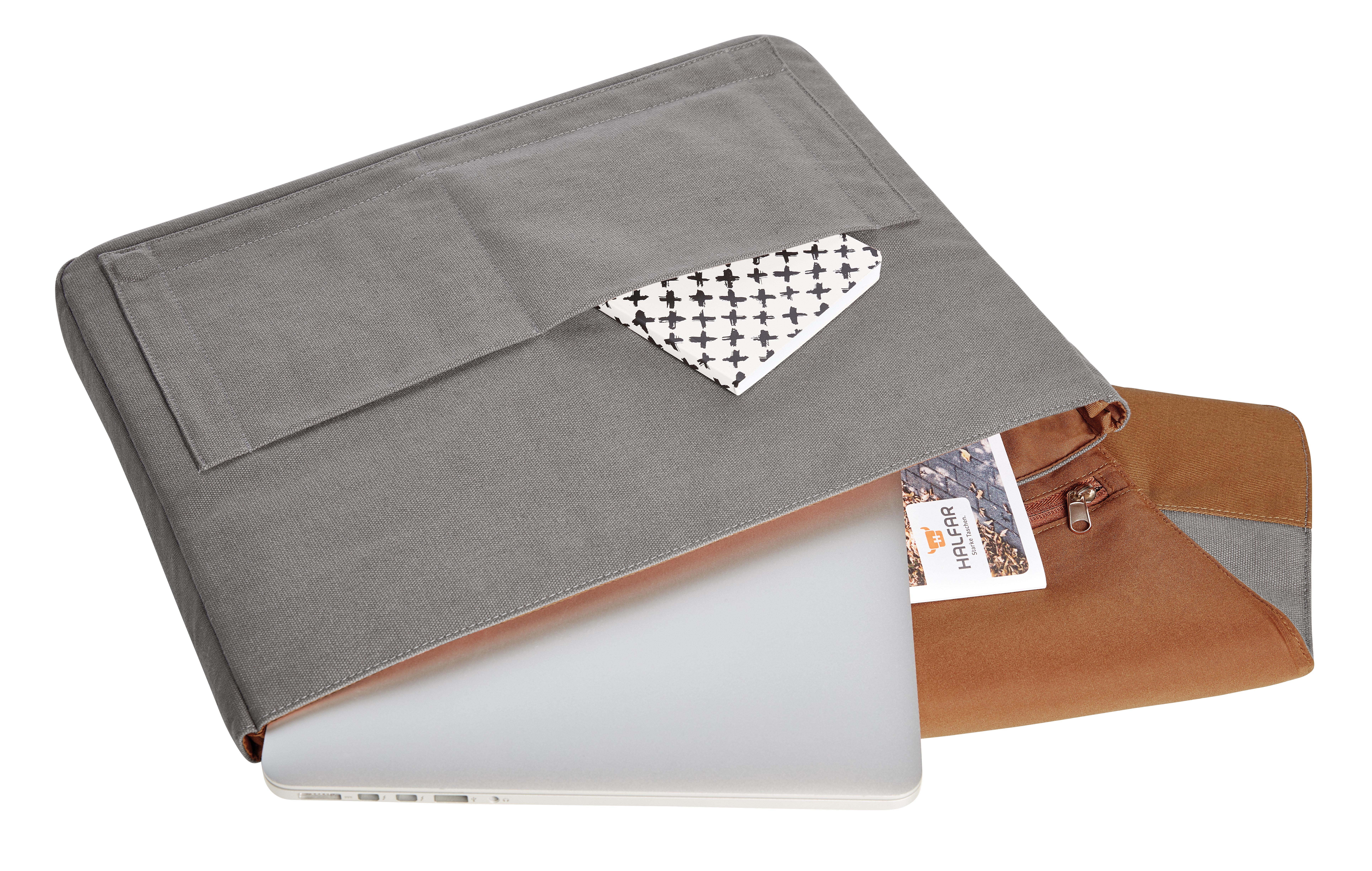 Moderní, propracovaný obal na notebook | Krásné provedení s bavlněným lemem s povrchovou úpravou | Vhodné na notebooky a dokumenty DIN A4 | Dvě ploché vložené kapsy na přední straně | Přihrádka na zip ve vnitřní chlopni | Velký oddíl na zip vzadu | Magnet