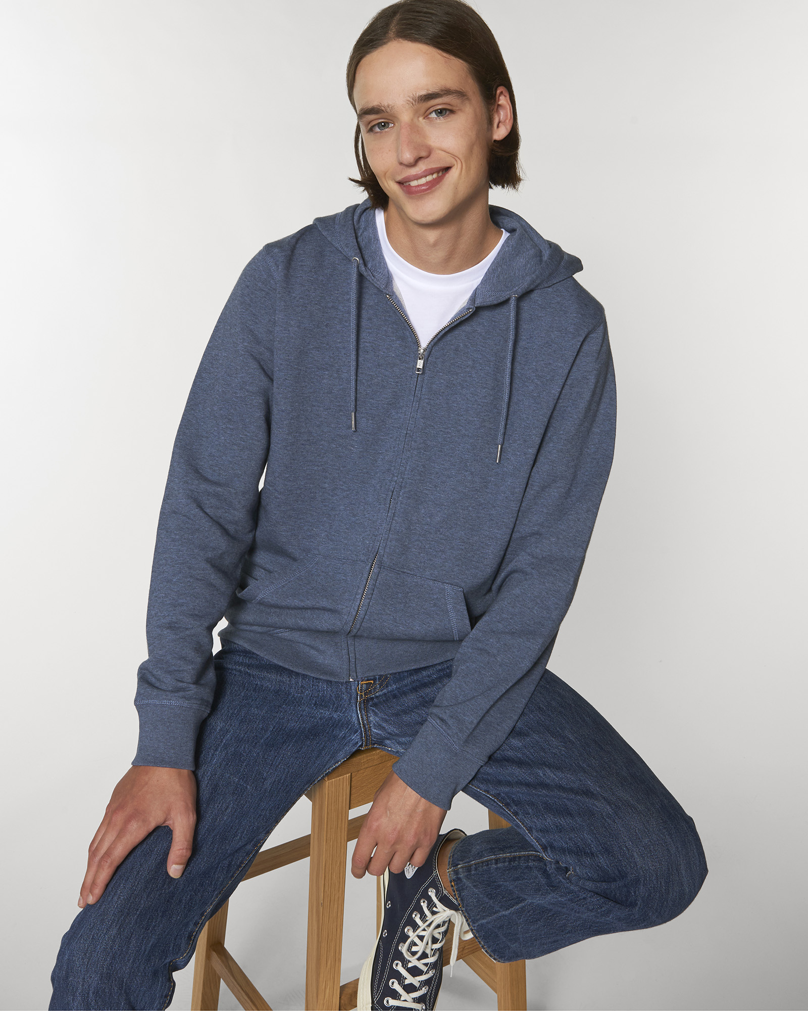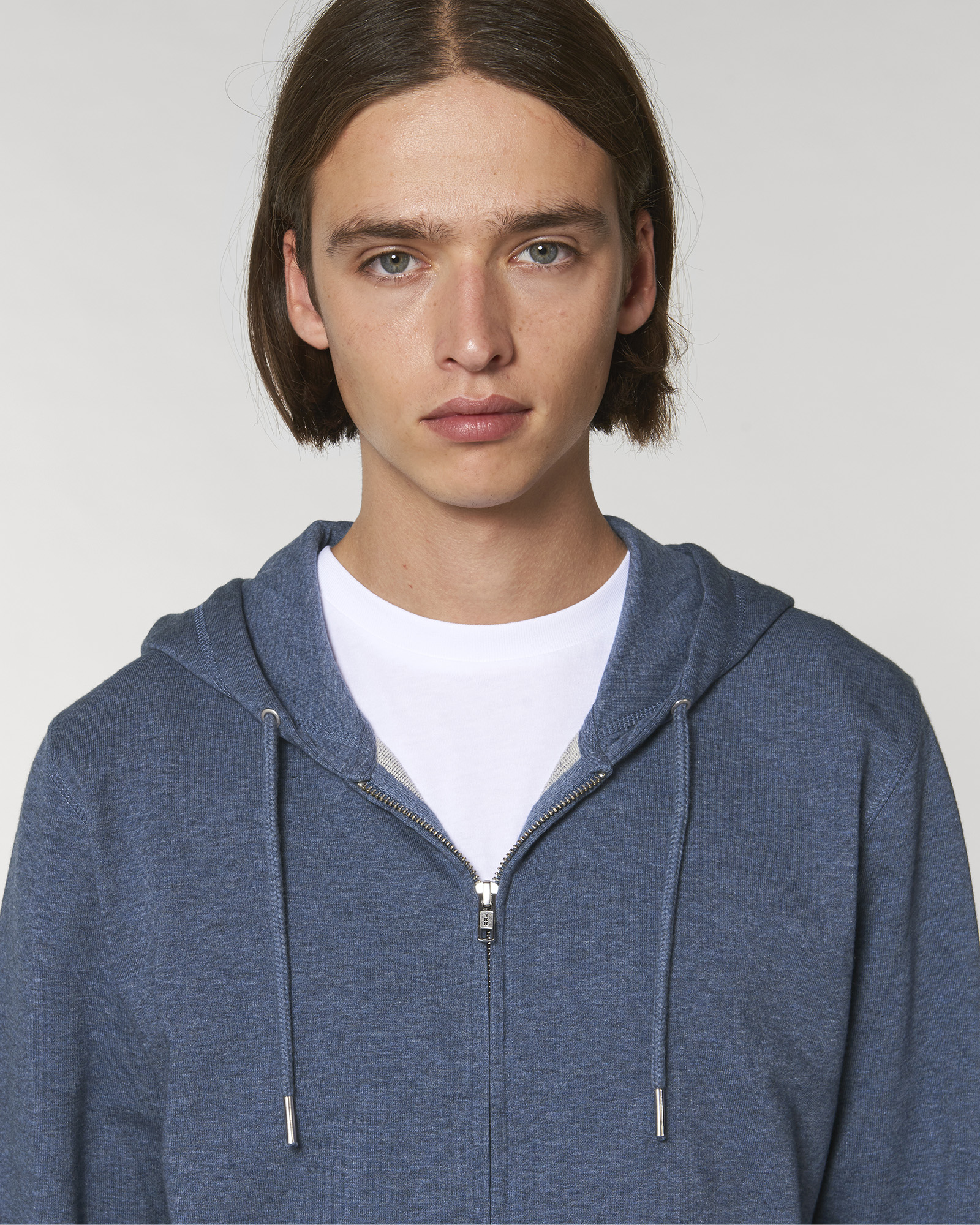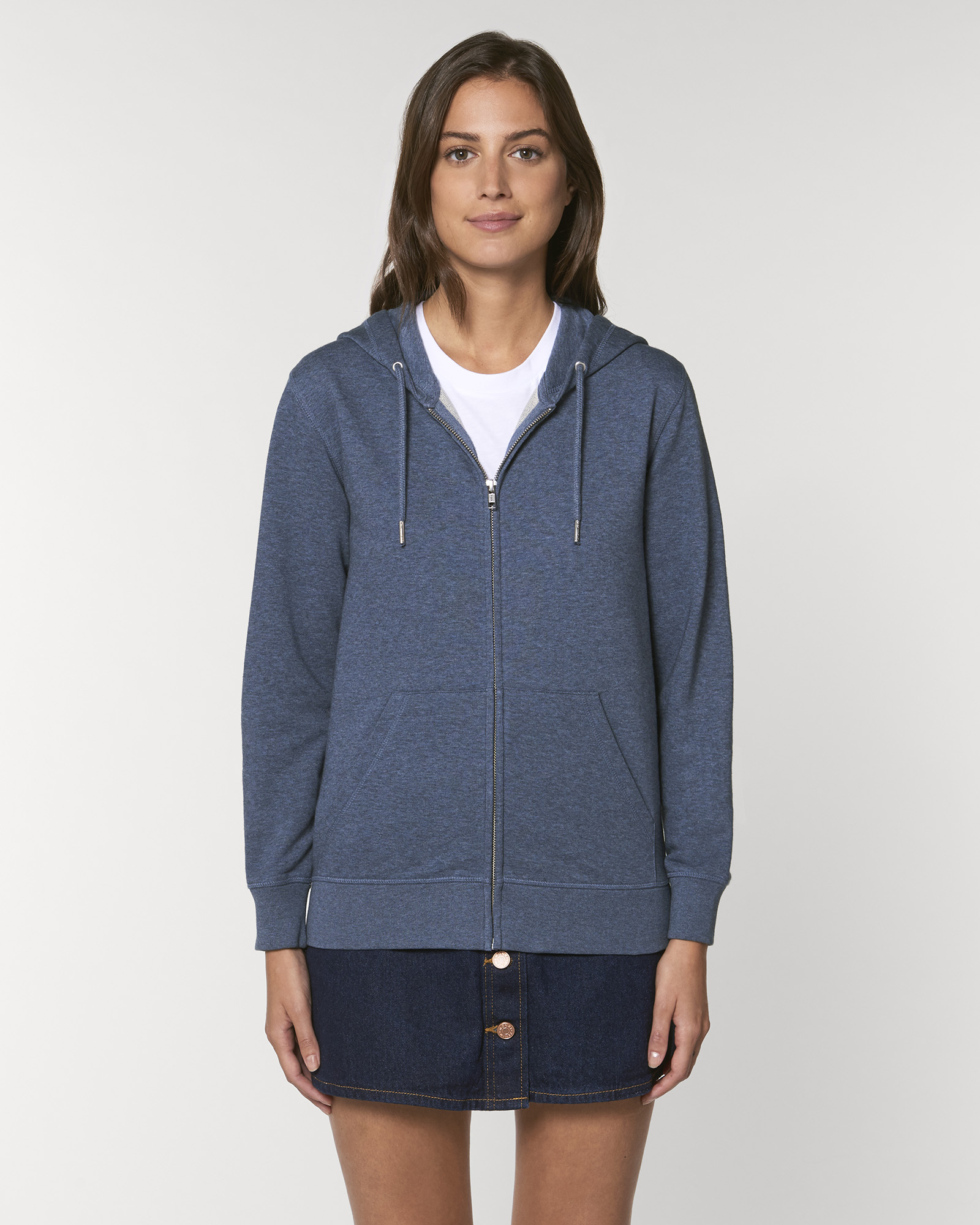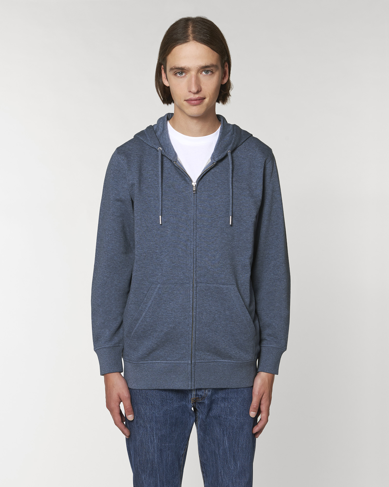 Unisexová mikina vyrobena z bavlny a polyesteru. Podšitá kapuce, šňůrky v barvě textilu s kovovým zakončením. Kovový krytý zip. Klokaní kapsa. 1x1 žebrování u lemu rukávů a spodního lemu.