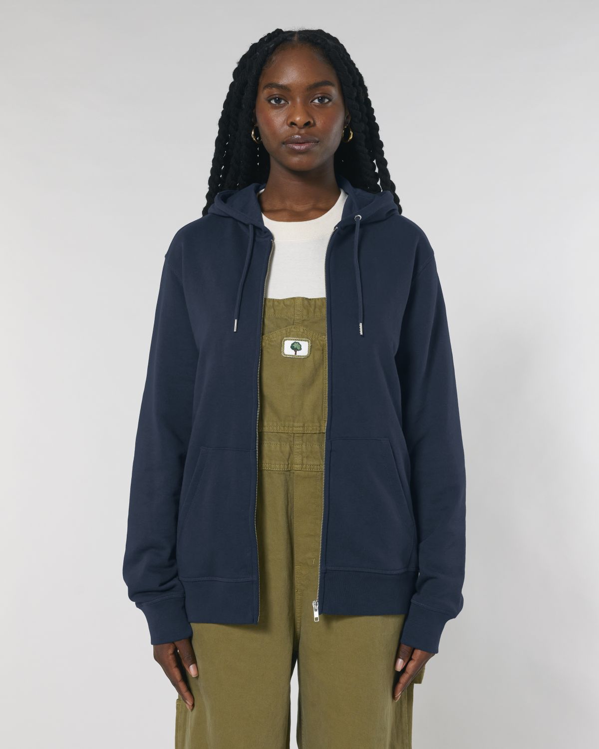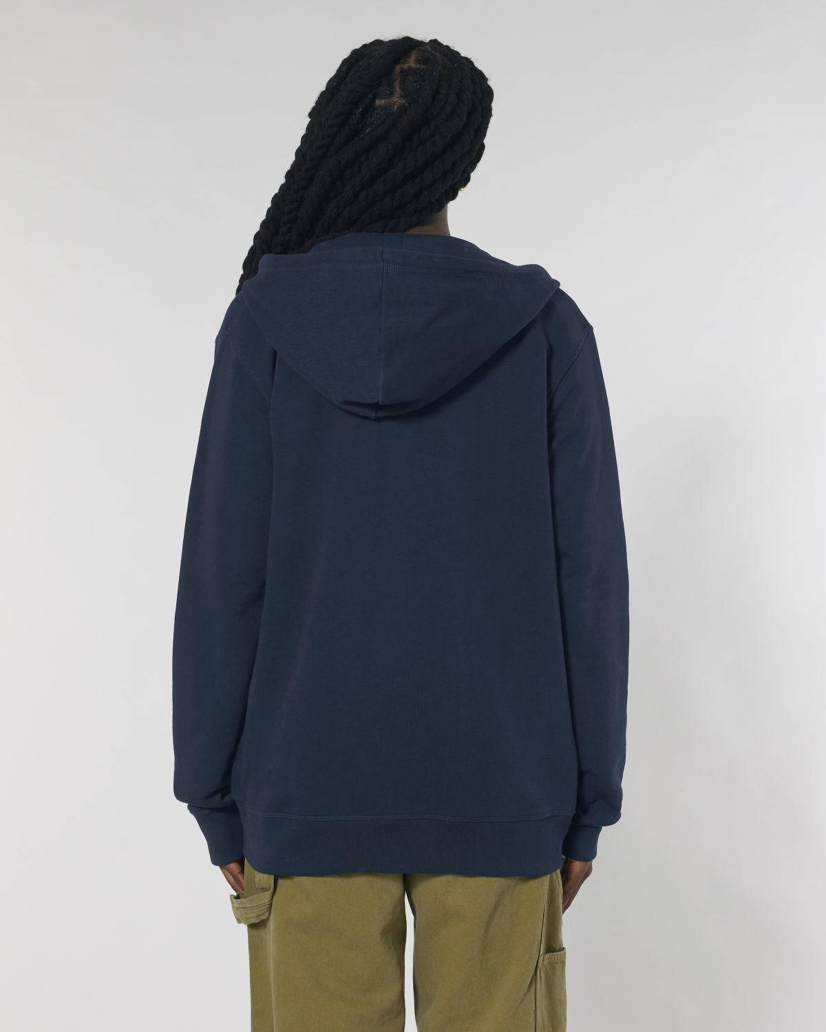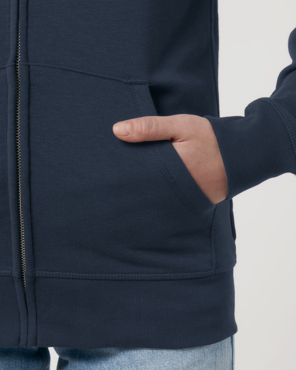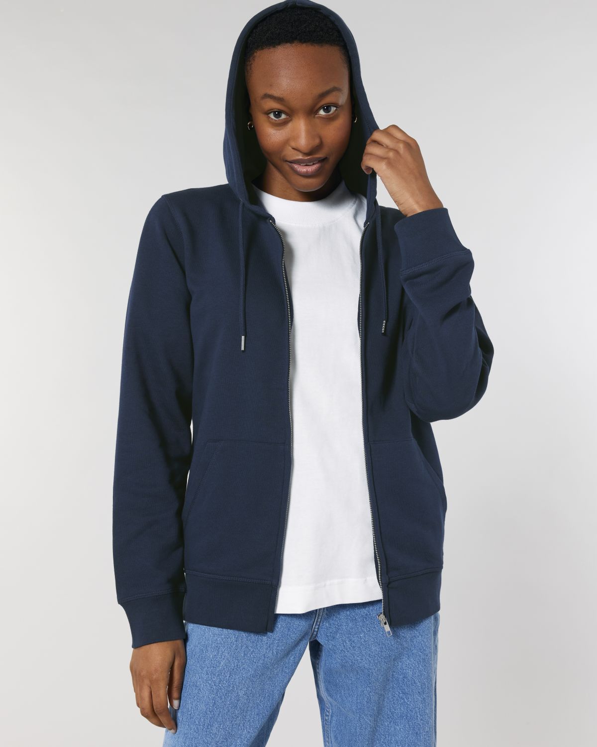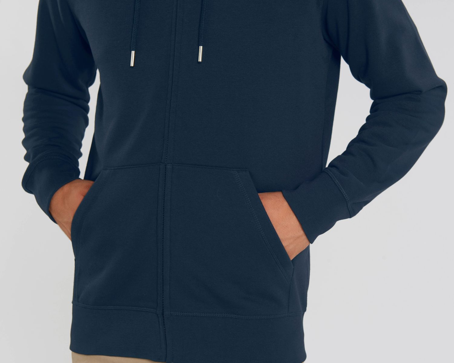 Unisexová mikina vyrobena z bavlny a polyesteru. Podšitá kapuce, šňůrky v barvě textilu s kovovým zakončením. Kovový krytý zip. Klokaní kapsa. 1x1 žebrování u lemu rukávů a spodního lemu.