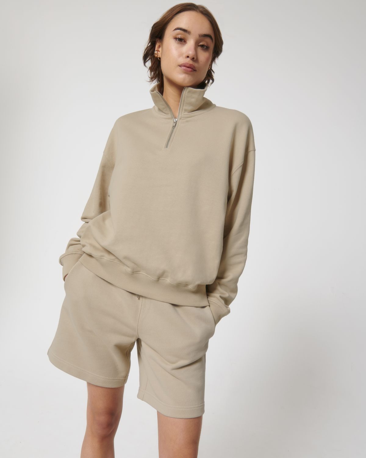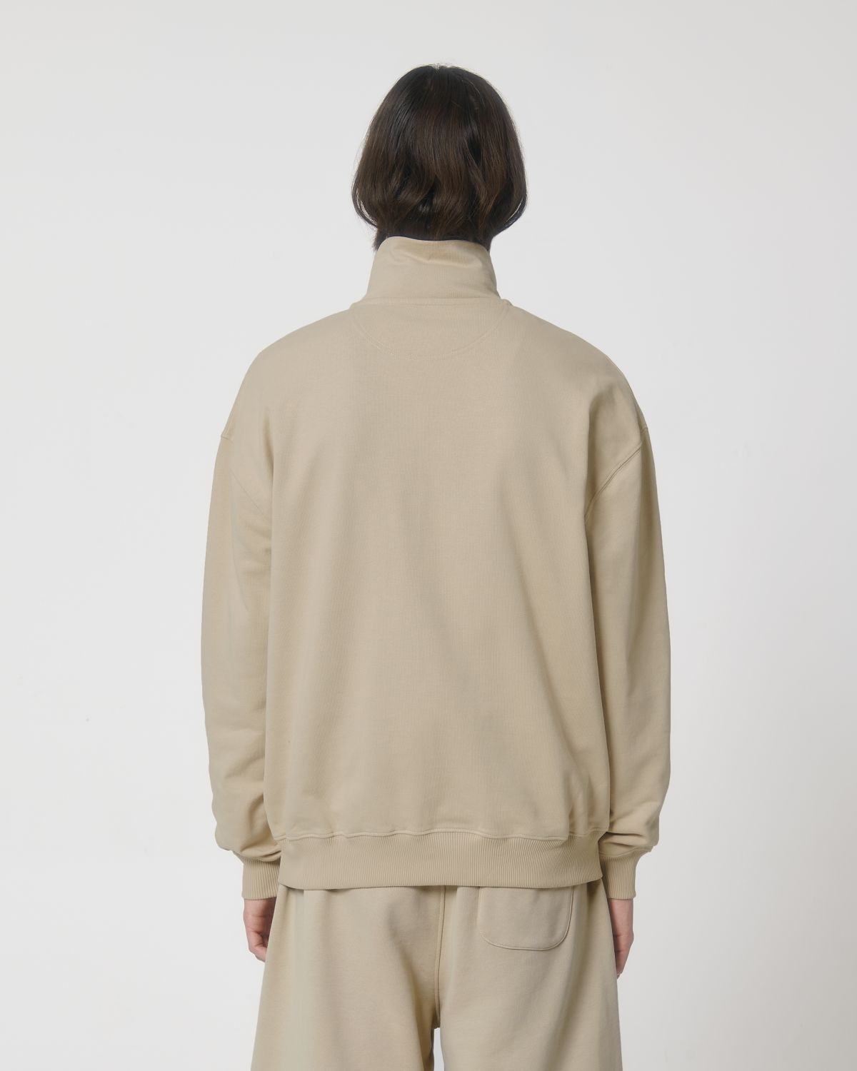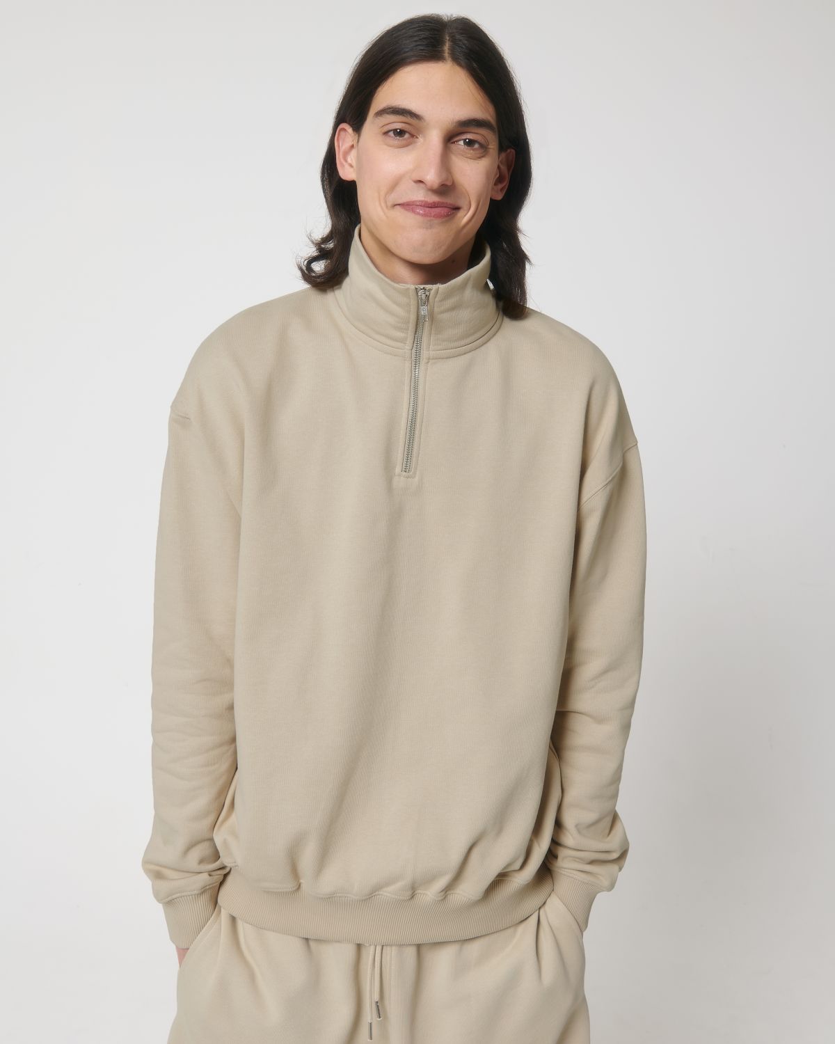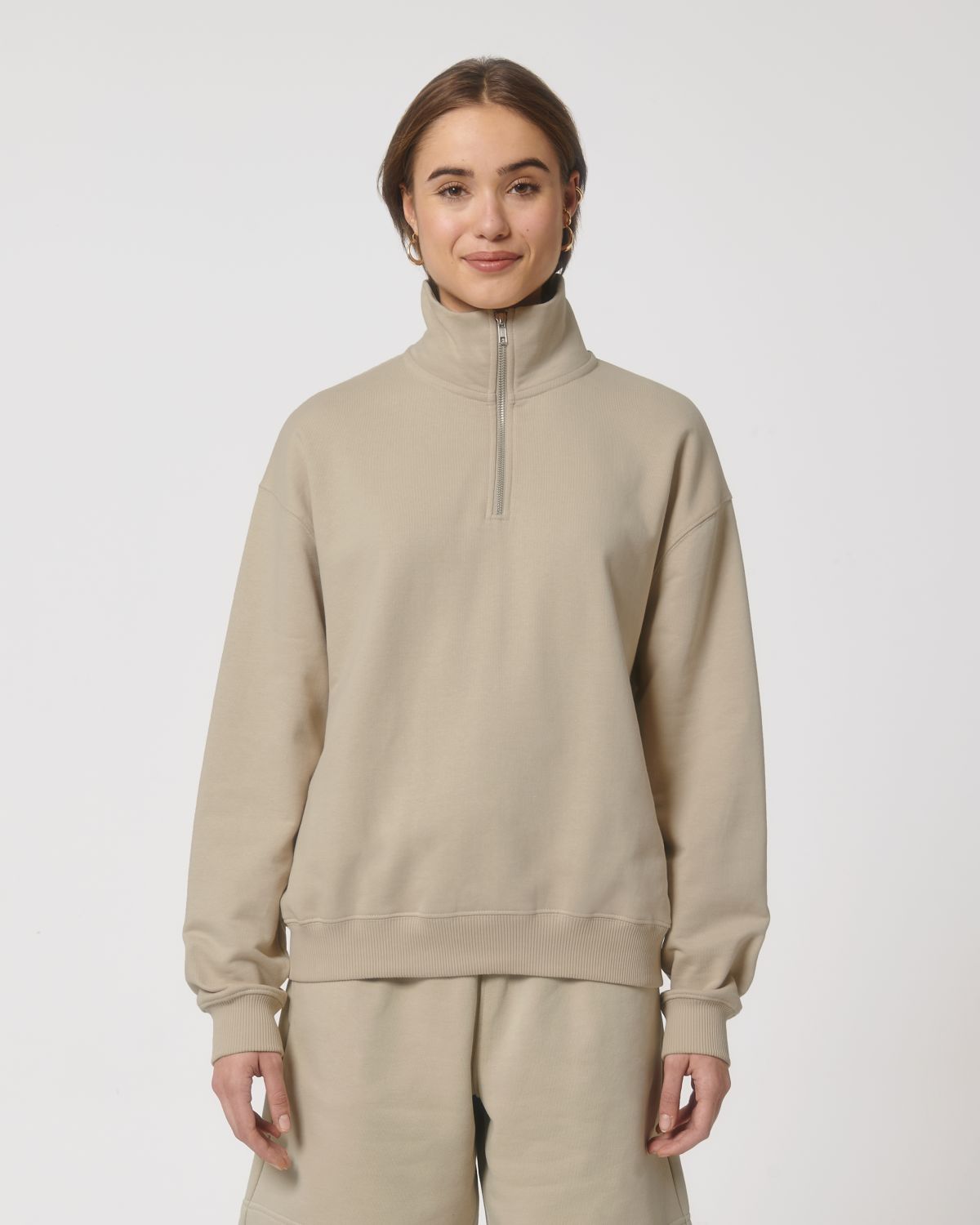 Bavlněná unisexová mikina se stojáčkem. Zip v horní třetině předního dílu. 2x1 žebrování rukávů a spodního lemu, dvojité prošívání.
