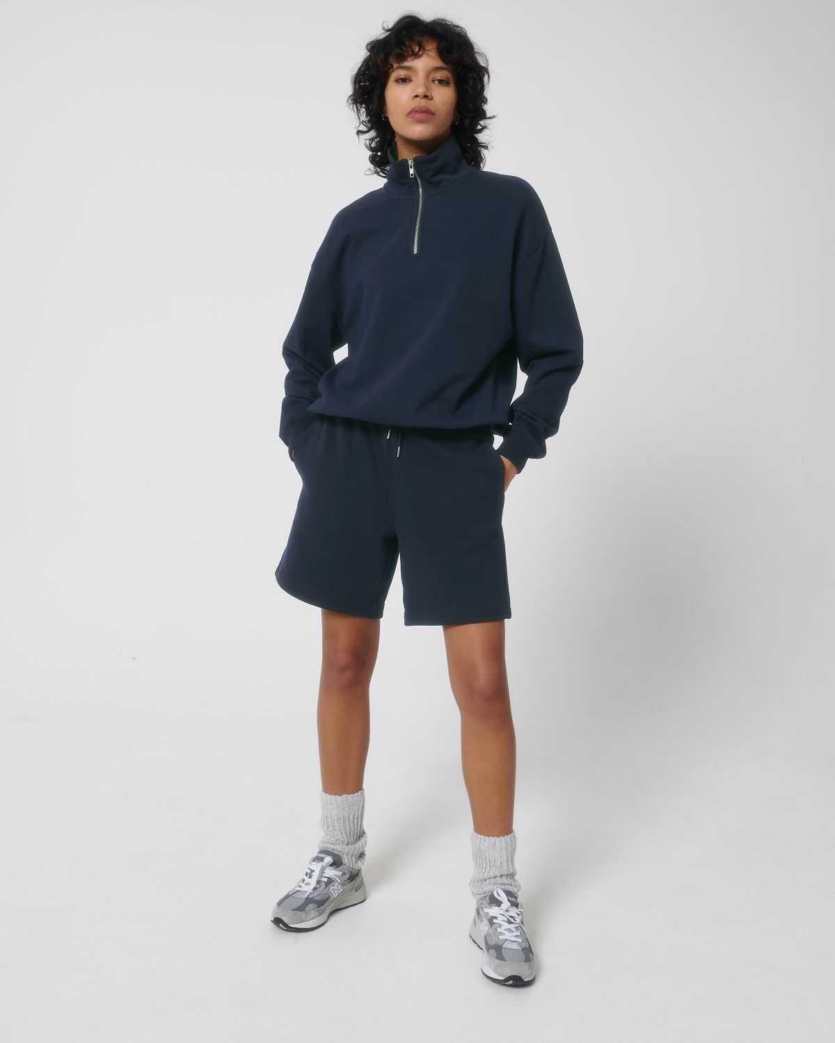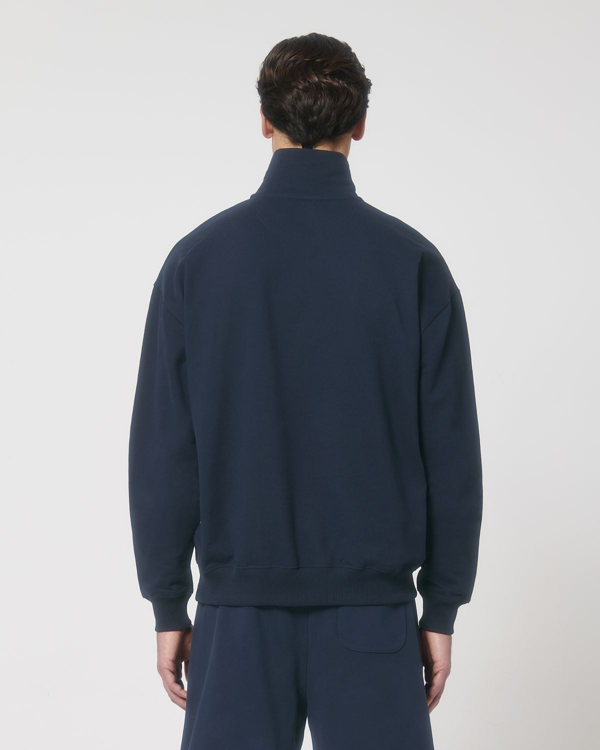 Bavlněná unisexová mikina se stojáčkem. Zip v horní třetině předního dílu. 2x1 žebrování rukávů a spodního lemu, dvojité prošívání.