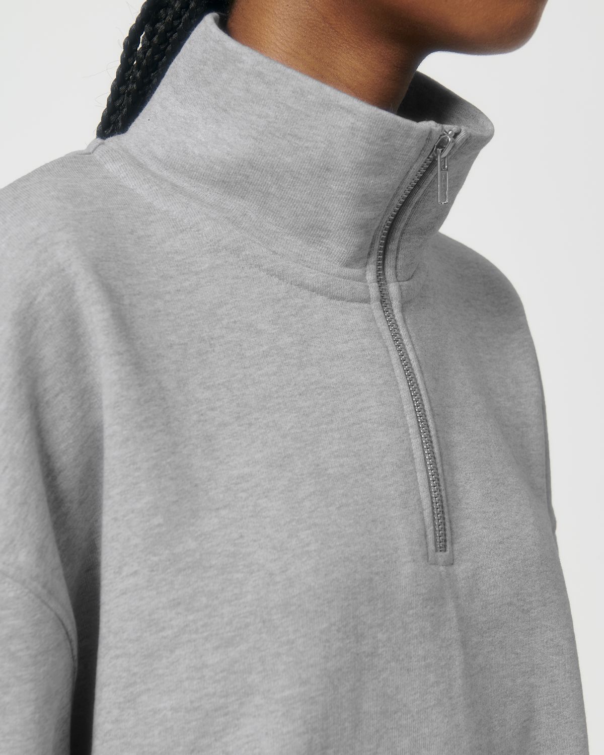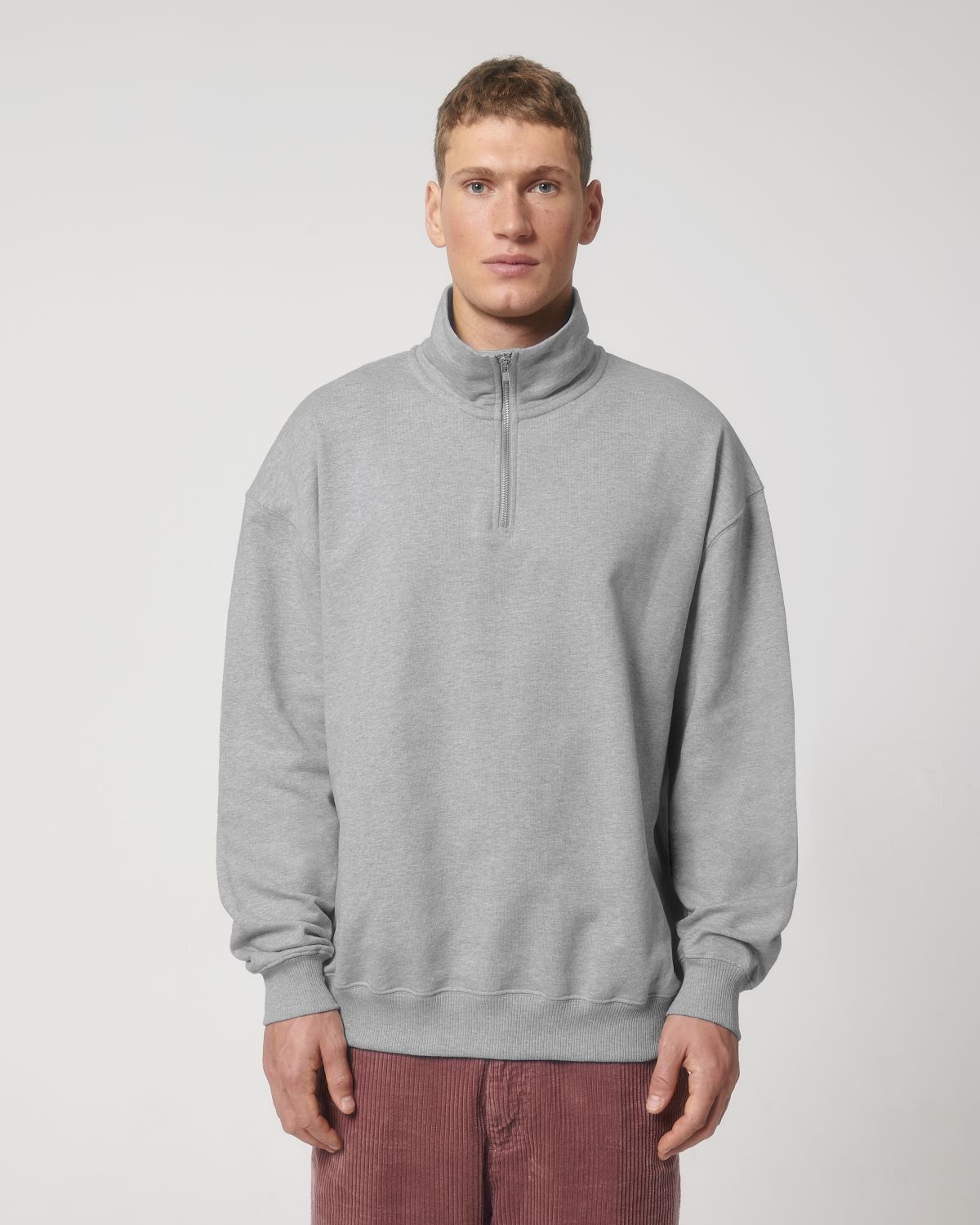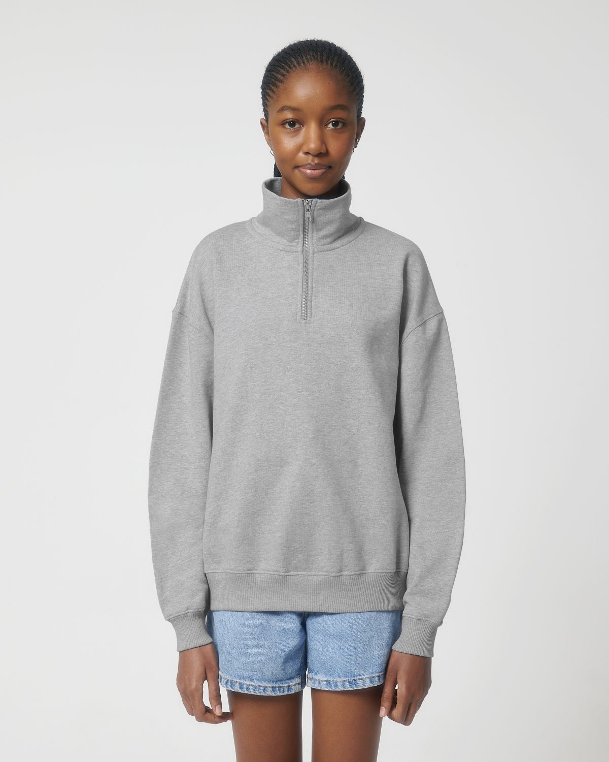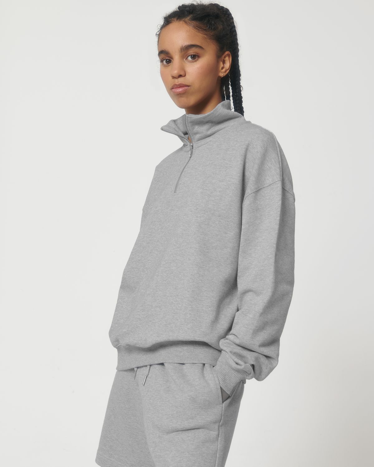 Bavlněná unisexová mikina se stojáčkem. Zip v horní třetině předního dílu. 2x1 žebrování rukávů a spodního lemu, dvojité prošívání.