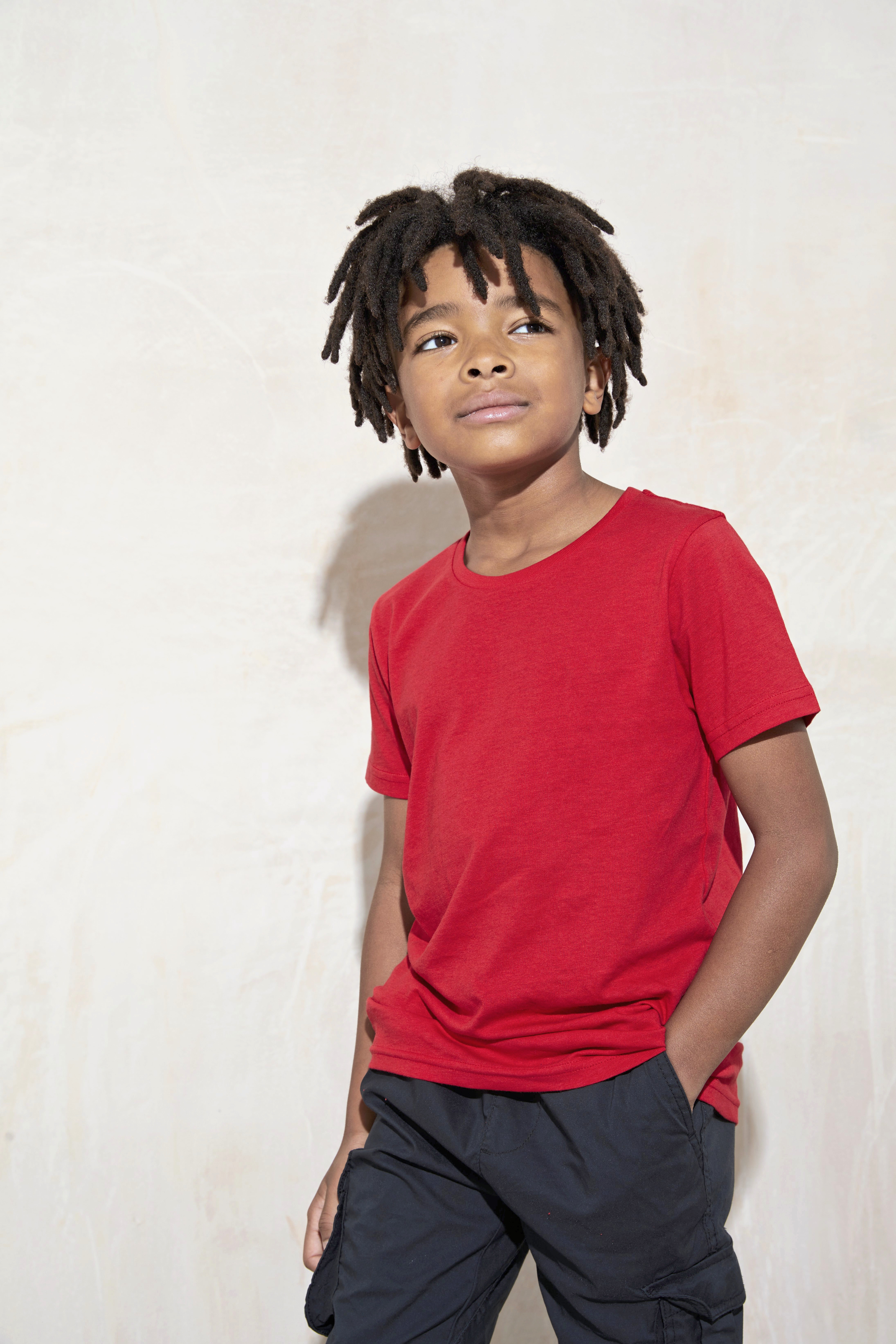 Česaná kruhově dopřádaná bavlna. Moderní střih s postranními švy. Krátké rukávy. Pouze štítek s velikostí– černé označení pro unisex. Zpevňovací páska za krkem. Žebrovaný kulatý výstřih. Dvojité prošití na rukávu a spodním lemu. Jmenovka.