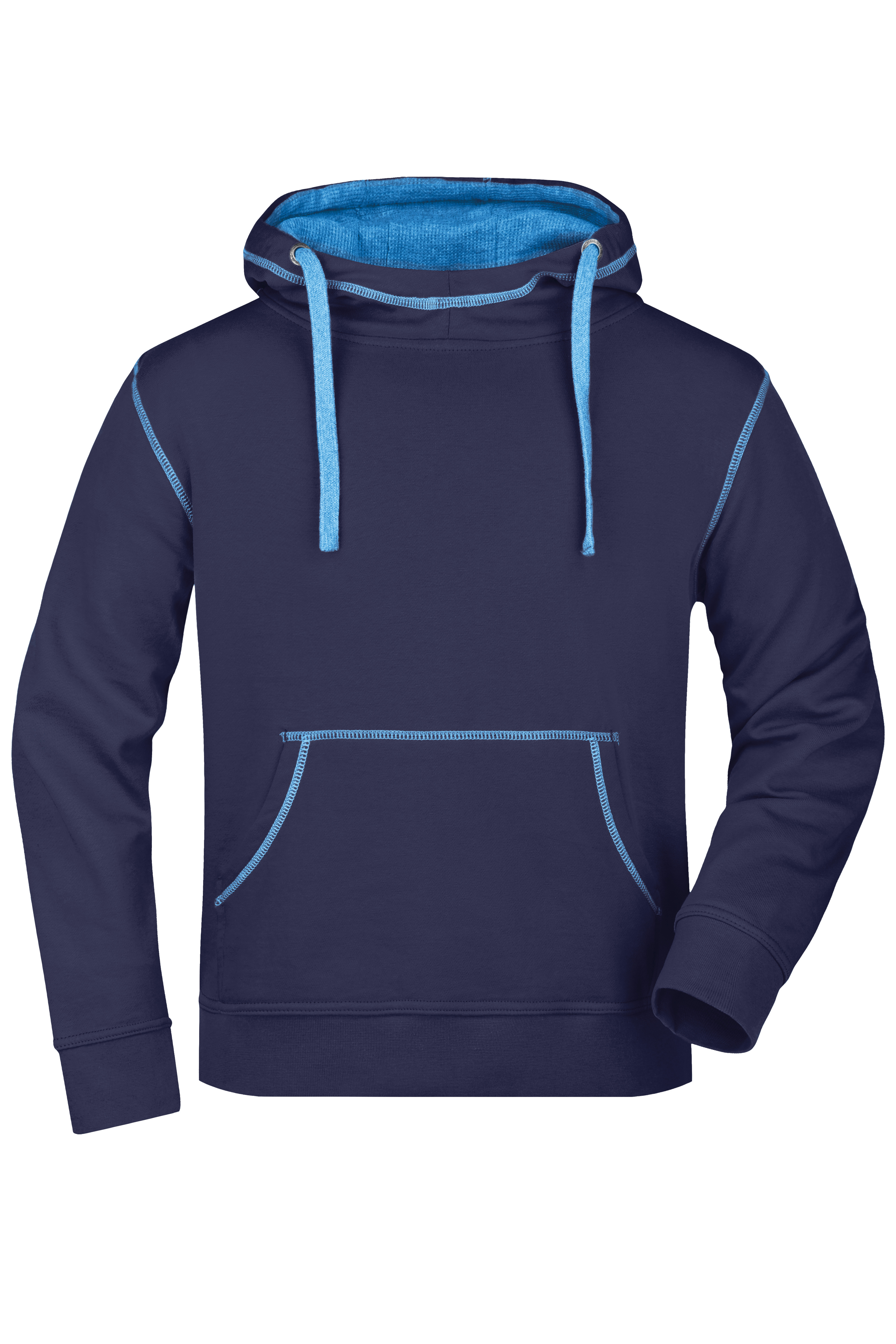 Mikina s kapucí s módními kontrastními švy. Vysoce kvalitní mikina s kapucí, uvnitř zdrsněná. Manžety s elastanem. Kontrastní barva prošívání plochým švem. Dvouvrstvá kapuce uvnitř a šňůrka v kontrastní barvě. Kapsa klokanka. Česaná kruhově dopřádaná bavlna.